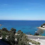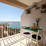The accommodation overlooks the sea and comprises a balcony and a sitting area with climate control and a washing machine. The apartment features a bathroom with hairdryers and bath sheets.